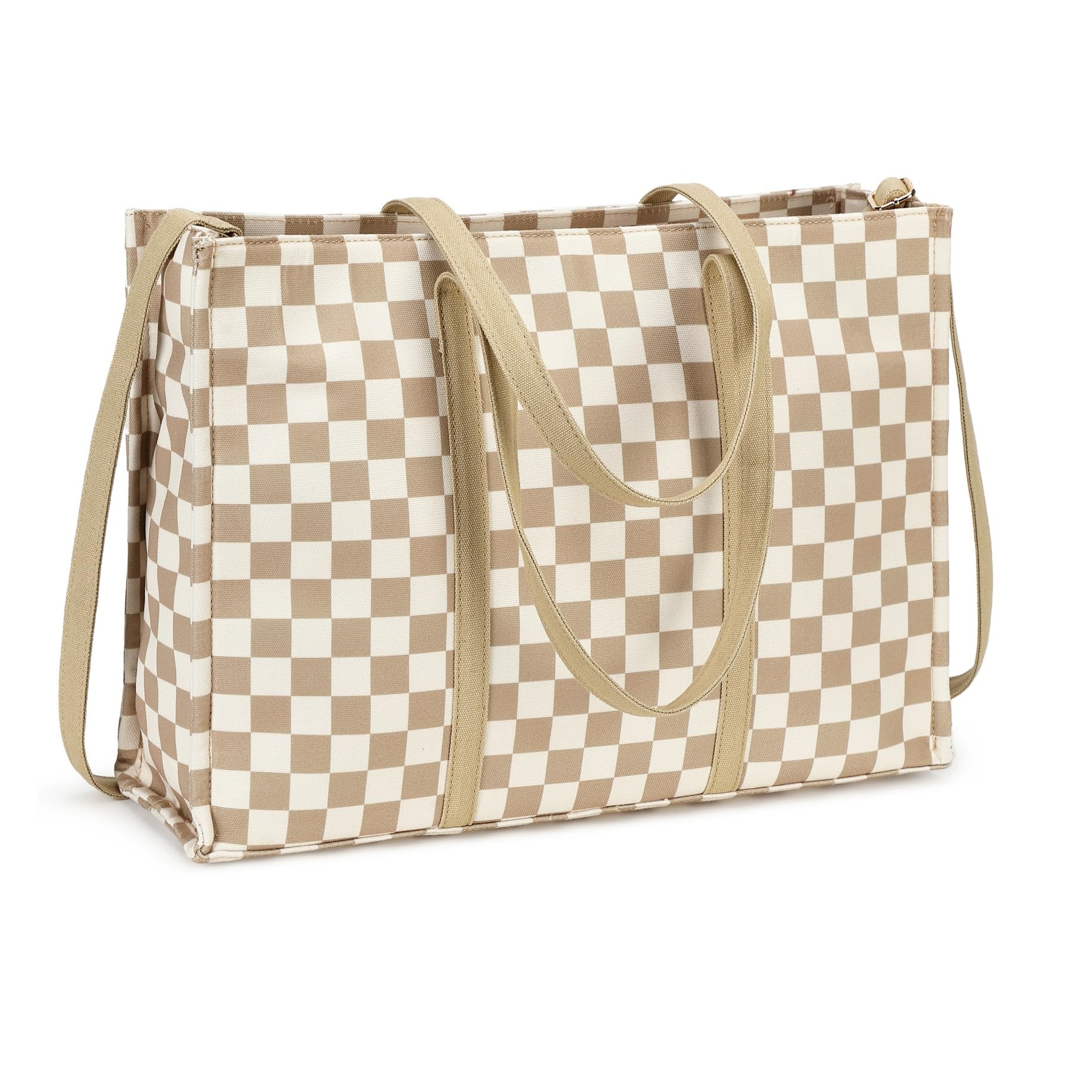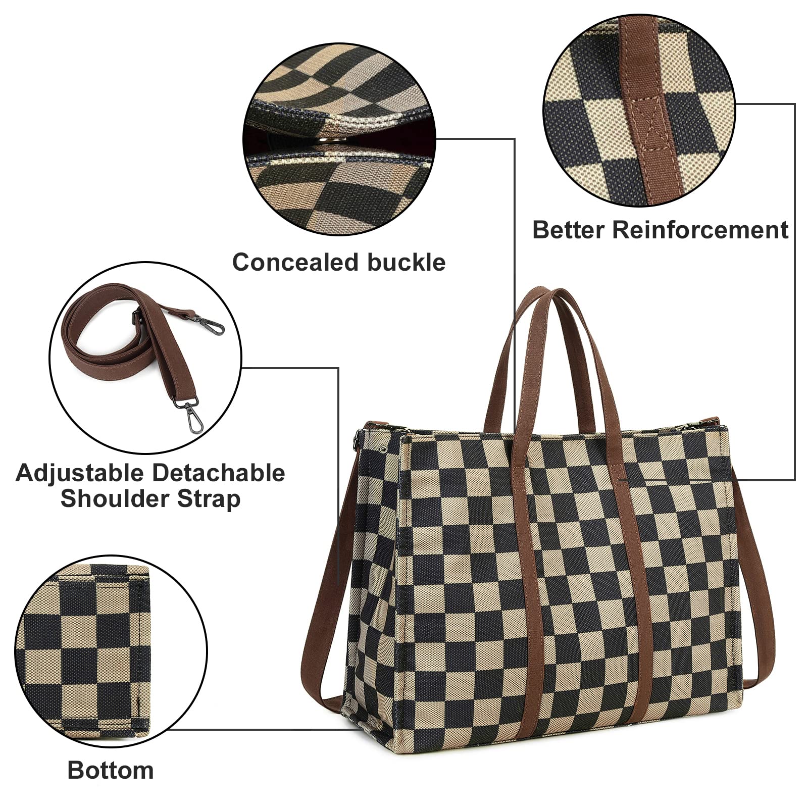 Ounamei Checkered Canvas Work Tote | Zippered Laptop Shoulder & Crossbody Bag (15.6–16”)