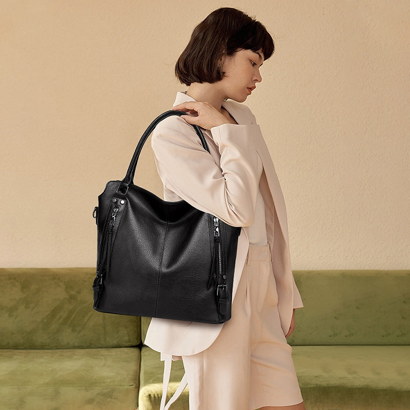 Designed with practicality in mind, the roomy interior easily accommodates daily essentials such as a wallet, phone, cosmetics, notebook, or tablet. A matching small pouch is included to keep smaller items neatly organized and within easy reach.