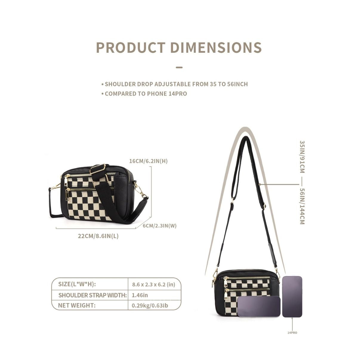 Dimensions: 8.6” L × 2.3” W × 6.2” H (22 × 6 × 16 cm) — perfectly sized to hold your phone, wallet, keys, and makeup essentials.