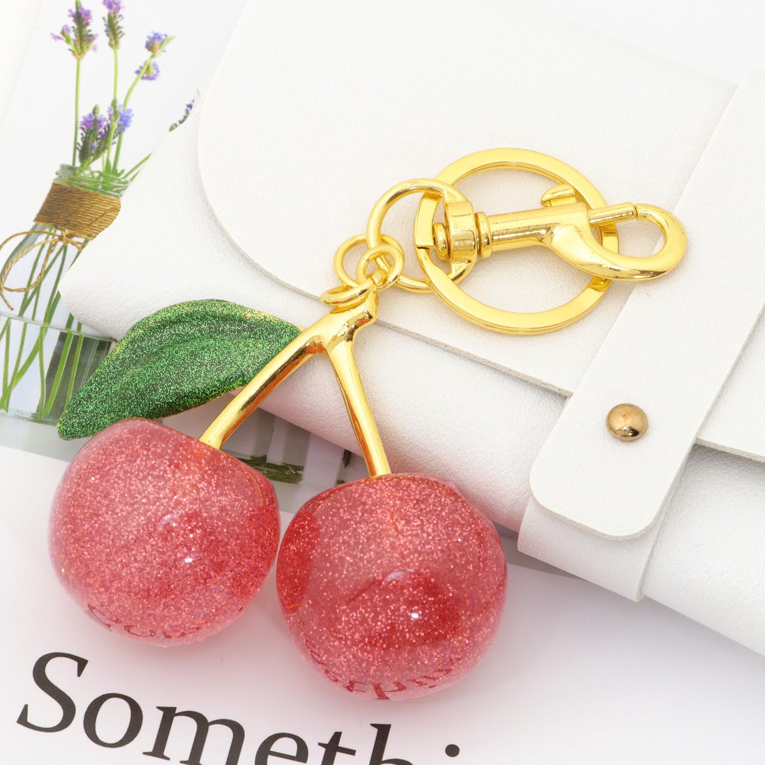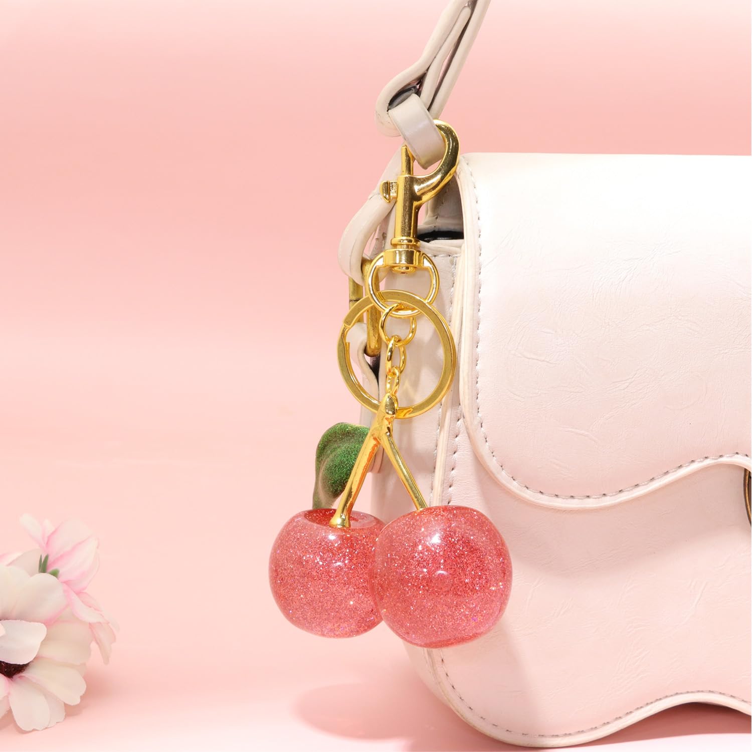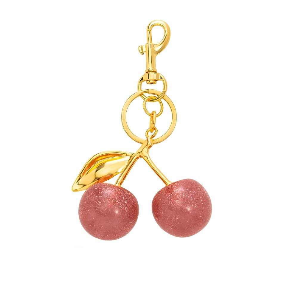 Bright cherry details with a glossy finish add a playful and stylish touch to handbags, backpacks, or keyrings.